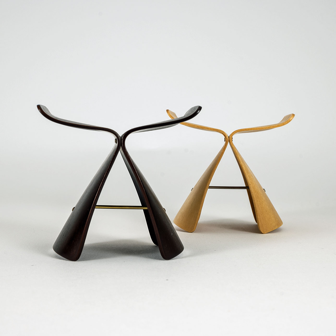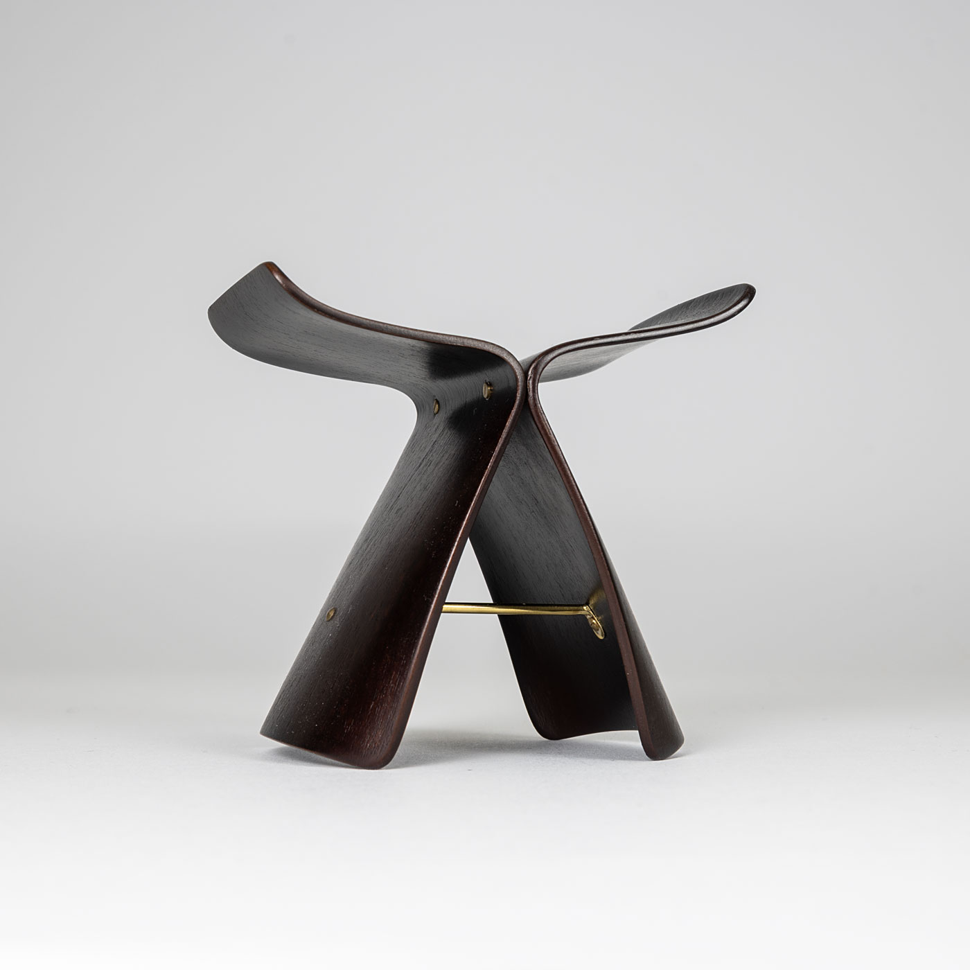 Der Hocker besteht aus zwei gleichförmigen, verformten Sperrholzelementen, die lediglich mit zwei Schrauben und einer Messingstange verbunden sind. Durch die Verbindung beider Elemente entsteht eine Form, die in gewisser Weise auf ein Torii hinweist, ein traditionelles japanisches Tor, das meist am Eingang von Shinto-Schreinen steht. Auch erinnert die leichte und geschwungene Silhouette beider Sitzschalen an die Flügel eines Schmetterlings, was dem Namen seinen Ursprung gibt.