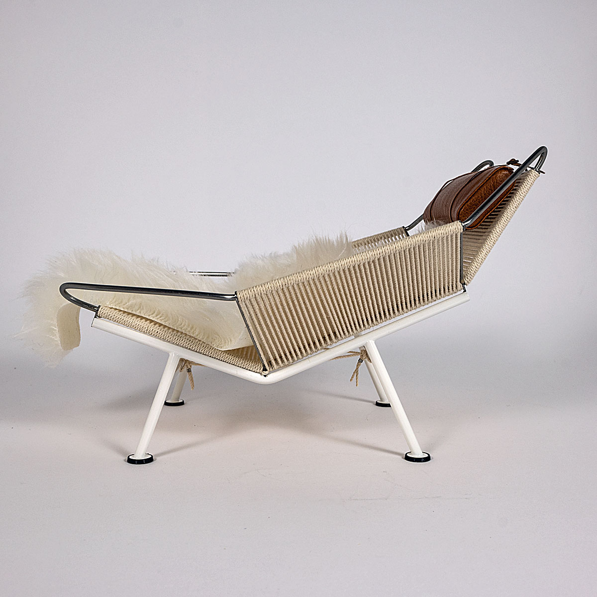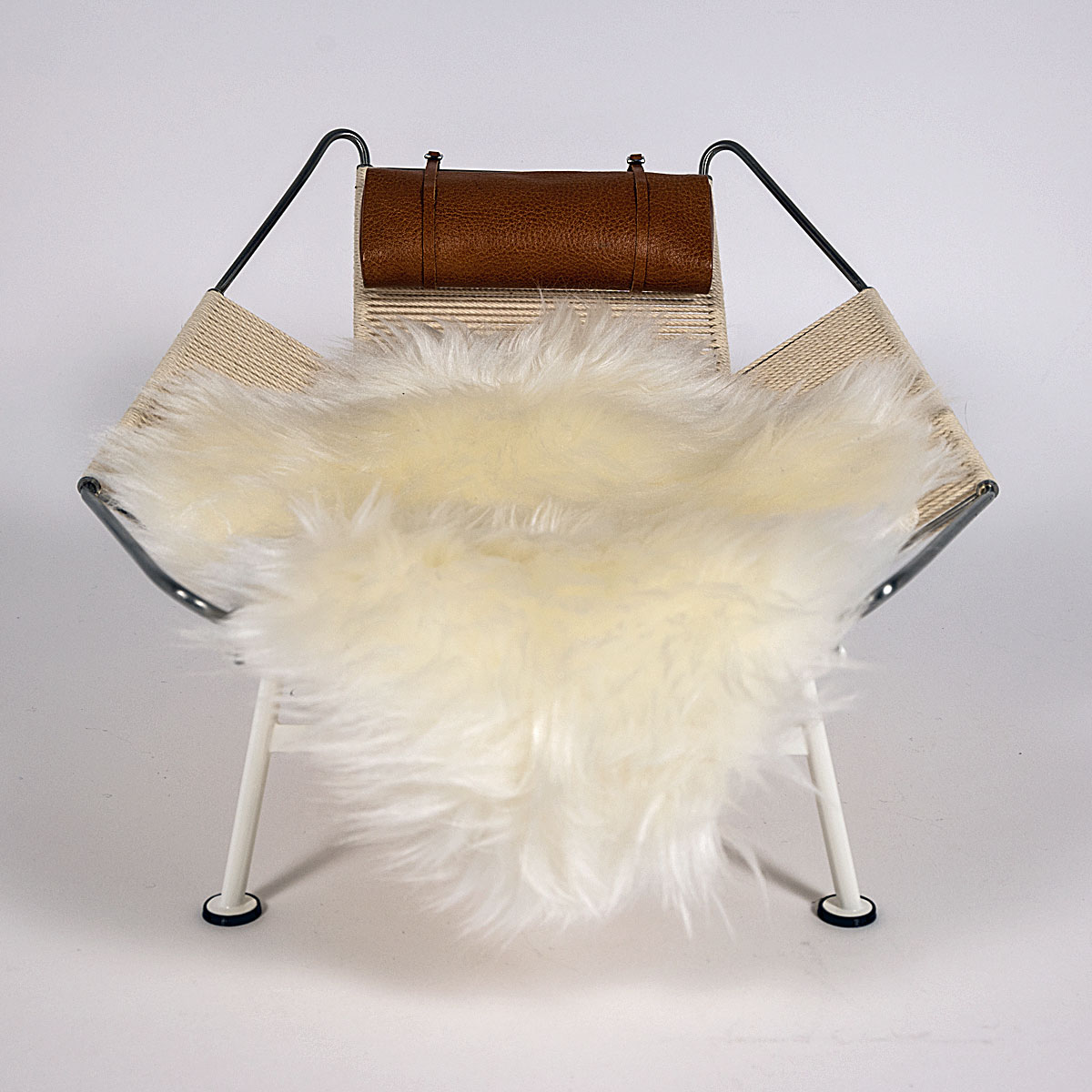 „Mit einem Gestell aus massivem Edelstahl, 220 Metern speziell entwickelter Flaggenleine für Sitz und Rückenlehne und einem langhaarigen Schaffell, das die industrielle Strenge des Stahls abmildert, verkörpert der Flag Halyard Chair den Inbegriff von Luxus und Entspannung.